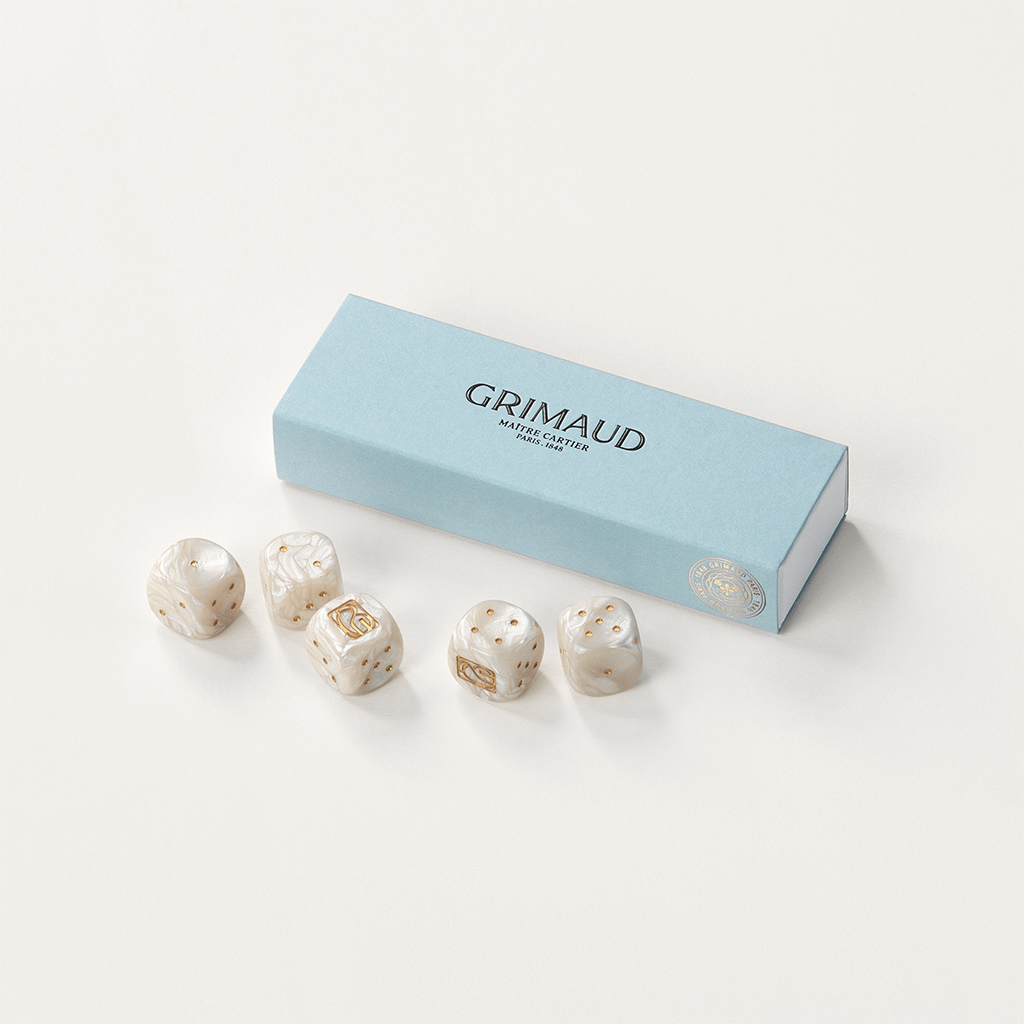 Presented in a Grimaud Dolphin Blue storage box, the 5 dices are made of white resin and engraved with classic gold dots, with the Grimaud monogram representing the number six.