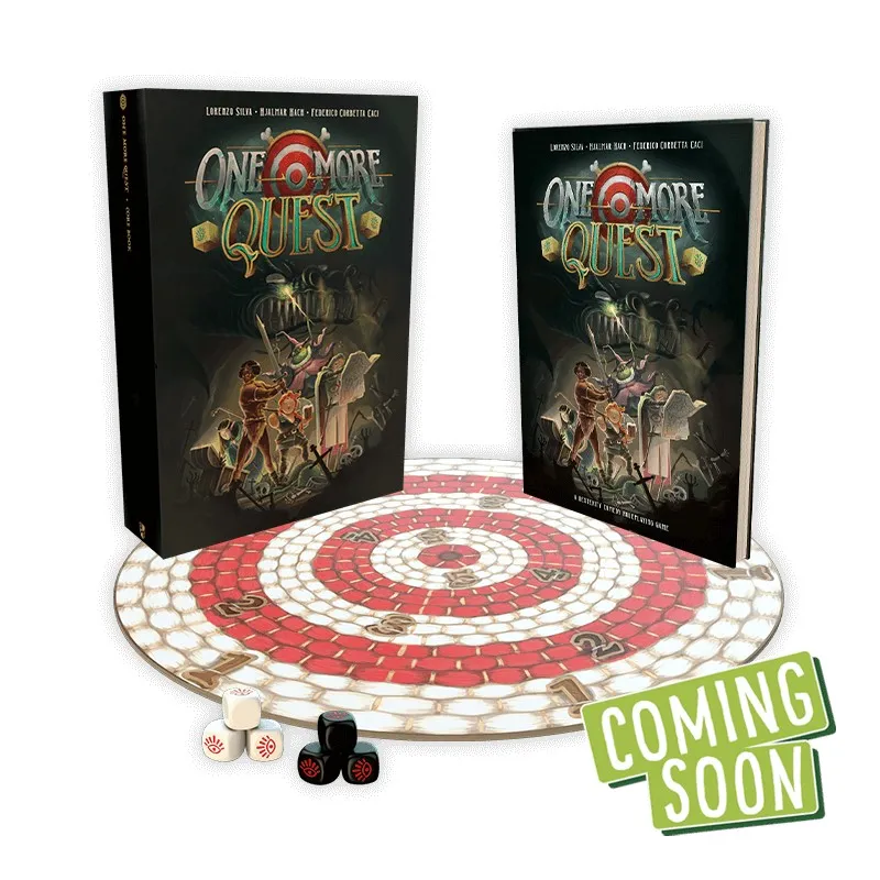 Designed for both casual and experienced players, One More Quest is a hilarious roleplaying game where the success or failure of your actions is determined by throwing dice at a Target board, trying to get as close to the center as possible, while performing whimsical throw restrictions emulating the challenge that your character is trying to overcome.
