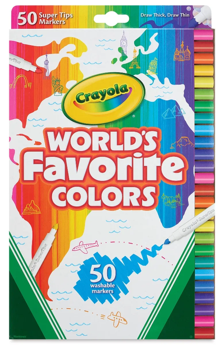 Bring global inspiration to your art with the Crayola World’s Favorite Colors 50ct SuperTips Markers! This vibrant set features 50 versatile markers handpicked from real color preferences shared by people around the world. From bold reds to calming blues, each shade reflects the emotional and cultural connections we all share through color. The washable, non-toxic formula makes cleanup easy and safe for kids.