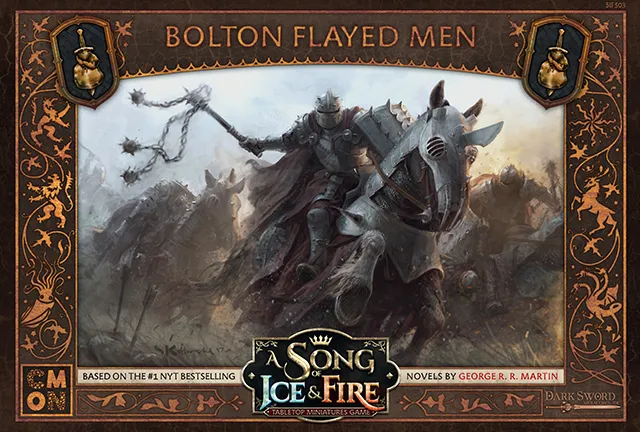 House Bolton has the most-armored unit on the field of battle. The Flayed Men cavalry are clad in heavy plate armor and their horses are equally armored in thick barding. Only the toughest and largest horses can withstand the great weight put upon them by all that steel. While they might not be the fastest cavalry unit, they are certainly the hardiest. And their own war flails make enemy defenses seem pointless as the spiked balls wrap around limbs or curve over shields. The Bolton Flayed Men Unit Box for the A Song of Ice and Fire: Tabletop Miniatures Game allows Commanders to field a rough and rugged cavalry unit in their forces. As a Neutral unit, The Flayed Men will work for any army willing to pay their price. They have some of the best Defense Saves in the game, letting them stay on the field, utilizing their nasty war flails on the enemy for quite some time.