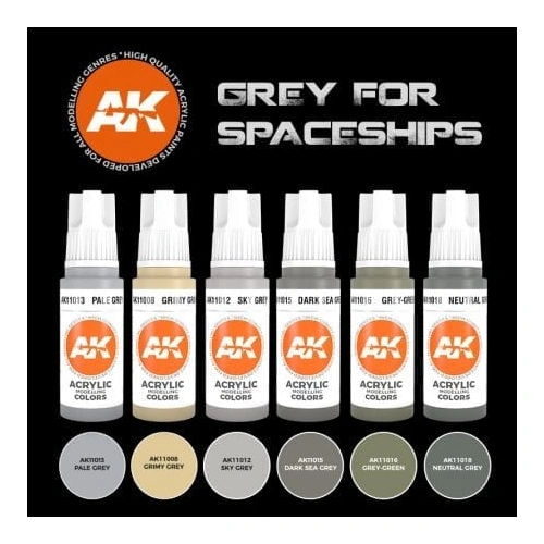This set contains 6 acrylic paints essential for painting any grey figure or spaceship model, making the proper shop transitions between the shades to achieve a realistic look. They can be applied by brush, taking advantage of the 3rd generation high coverage and adhesion. When diluted with dedicated thinner, they can be airbrushed as easily as lacquer-based paints. The set contains: AK11013 – Pale Grey AK11008 – Grimy Grey AK11012 – Sky Grey AK11015 – Dark Sea Grey AK11016 – Grey Green AK11018 – Neutral Grey
