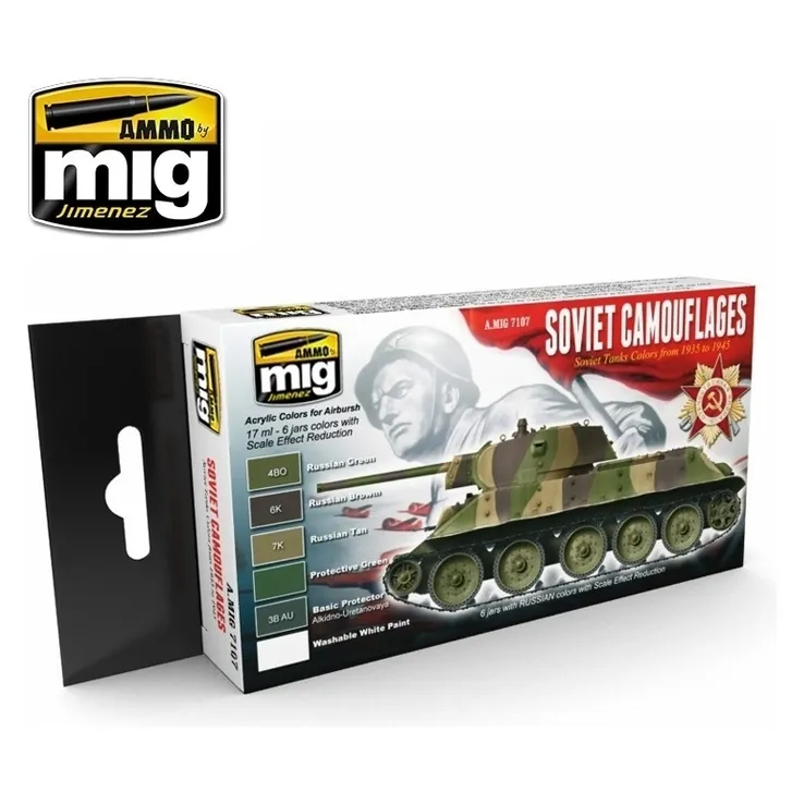 Acrylic paints set for the Red Army vehicles during the 1935-1945 period. Includes the widely used green khaki 4BO, the 7K sand, 6K brown, and two green colors of interwar period also seen at the beginning of World War II: the 3BAU and a green protective coating. This set also includes the new product A.MIG 024 WASHABLE WHITE CAMO for winter camouflage. This product is made from the same formula as the product used in reality by the Soviet Army, so it can be chipped and washed away as it actually occurred in real vehicles. All products are acrylic and are formulated for maximum performance both with brush or airbrush and the Scale Effect Reduction will allow us to apply the correct color on our models. Water soluble, odorless and non-toxic. Shake well before each use. We recommend A.MIG-2000 Acrylic Thinner for a correct thinning. Dries completely in 24 hours.