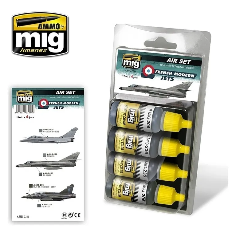 High-quality acrylic paints specially formulated to represent most of the camouflage schemes currently used by French aircraft, like the Mirage 2000D and Air Force and Navys Rafales or the recently withdrawn Super tendard among others. This set solves problems and doubts when mixing accurate base colors, saving precious modeling time. These exact color have been slightly lightened to compensate for the 'scale effect' which will allow us to apply the correct color on our models. Formulated for maximum performance both with brush and airbrush. Four acrylic colors in 17ml jars. Shake well before each use. Each jar includes a stainless steel ball agitator to facilitate mixture. Water soluble, odorless and non-toxic. We recommend A.MIG-2000 Acrylic Thinner for correct thinning. Dries completely in 24 hours.