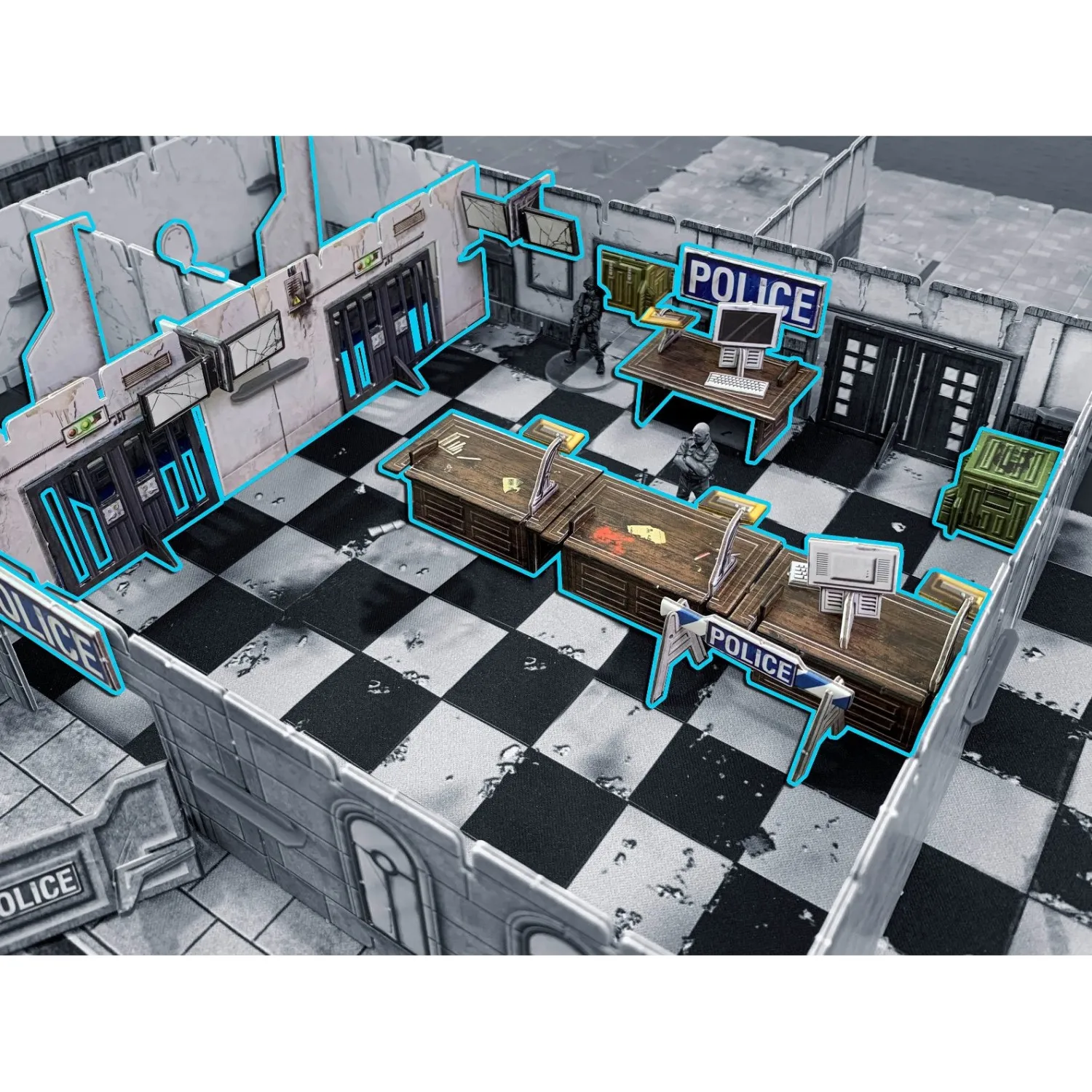 This pack contains everything you need to upgrade your urban gaming table with a police station. It comes complete with two jail cells, an office for the detectives and street furniture for crowd control, which doubles as great cover in a firefight! The set is compatible with any of the Battle Systems Urban Core Sets – the walls and clips from a core set will be required to construct a complete building.