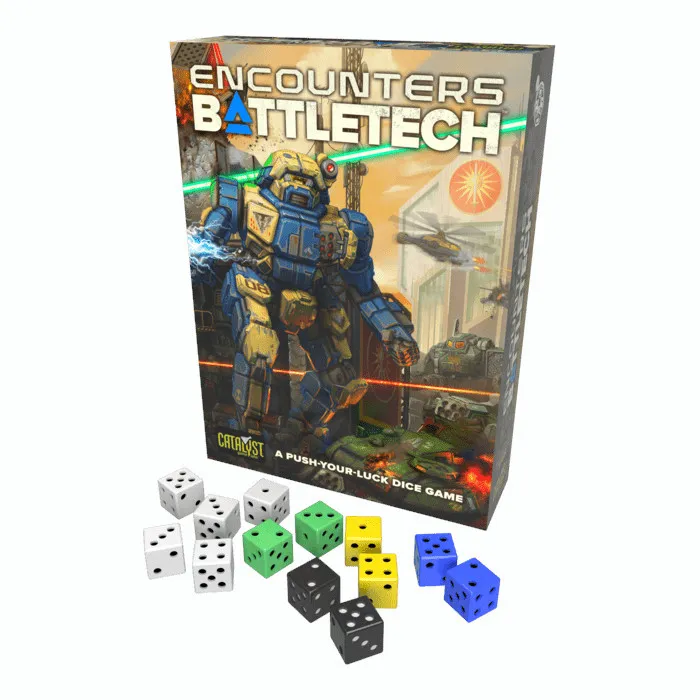 Encounters: BattleTech is a 1—8 player, fast-paced, push-your-luck dice and card game. Players act as mercenary commanders taking on contracts for the Great Houses. Defeating the enemies set to stop them earns C-bills to spend on the equipment needed to keep their unit afloat. If they defeat enough enemies, they'll complete their contract and gain the hard-earned reputation that all mercenaries seek. So grab some dice, pick your favorite mercenary unit, and show the Great Houses that you're the best mercs in the Inner Sphere!