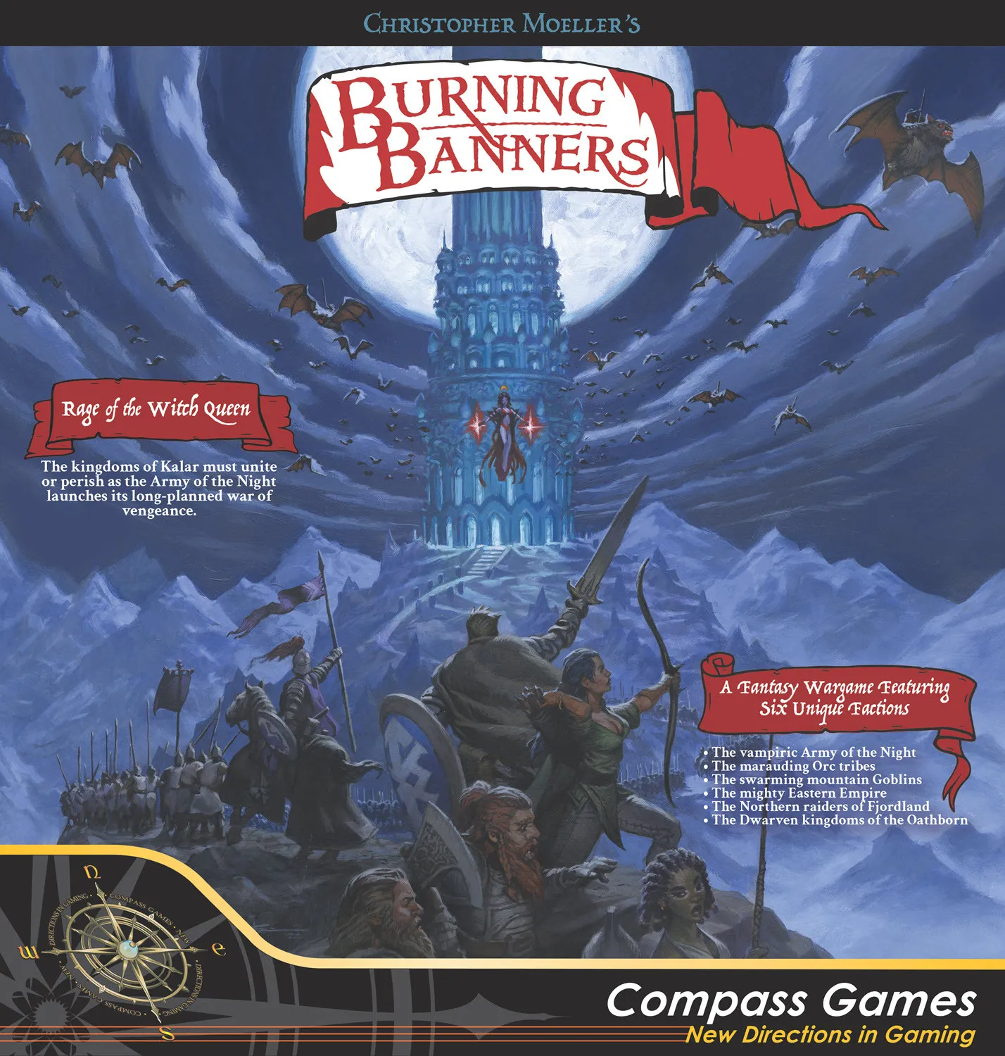 Burning Banners: Rage of the Witch Queen is a fantasy wargame for two to six players. Fast playing and intuitive, a whopping 29 scenarios range from short campaigns with 2 Kingdoms and one map, to the entire 12-year war, in which 6 kingdoms battle over four maps. The rules include a quick-playing Basic Game as well as an Advanced Game which introduces Magic, Heroes, and Monsters guarding powerful treasures.
