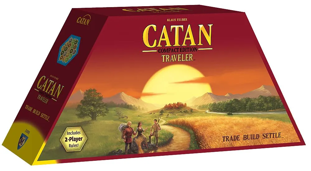 Whether you’re on the train, in the ski lodge or picnicking in the woods: This compact edition lets you take CATAN everywhere! The space-saving box unfolds to reveal the variable board. Roads, settlements and cities are safe in their locking drawers. Cards are held securely in holder trays. Even the dice, thanks to the practical hex-shaped shaker can’t get dropped and lost. CATAN compact is handy, fits easily into your luggage and contains all of the components and fun the “big” CATAN. Contents: 1 folding tough plastic box 6 double-sided plastic game board parts 1 dice shaker 97 plastic game pieces 2 plastic card holders 134 cards