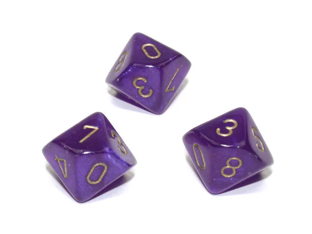 Borealis Polyhedral Royal Purple/gold Luminary d10 ~ Multiple loose dice are pictured to show all sides and possible color variations. Item Code is for individual dice.