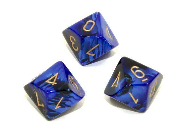 Gemini Polyhedral Black-Blue/gold d10 ~ Multiple loose dice are pictured to show all sides and possible color variations. Item Code is for individual dice.