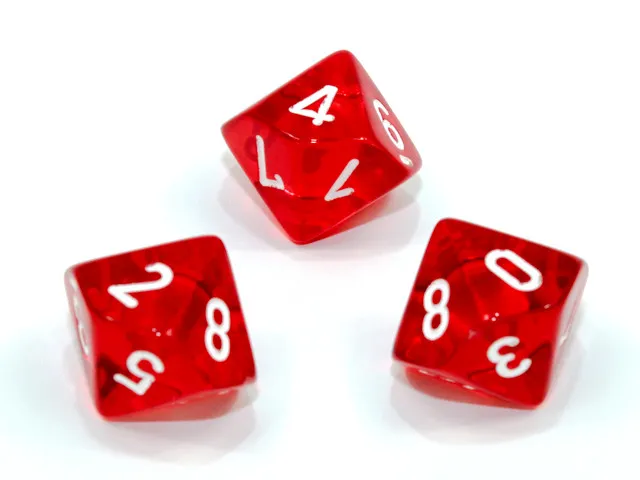 Translucent Polyhedral Red/white d10 ~ Multiple loose dice are pictured to show all sides and possible color variations. Item Code is for individual dice.