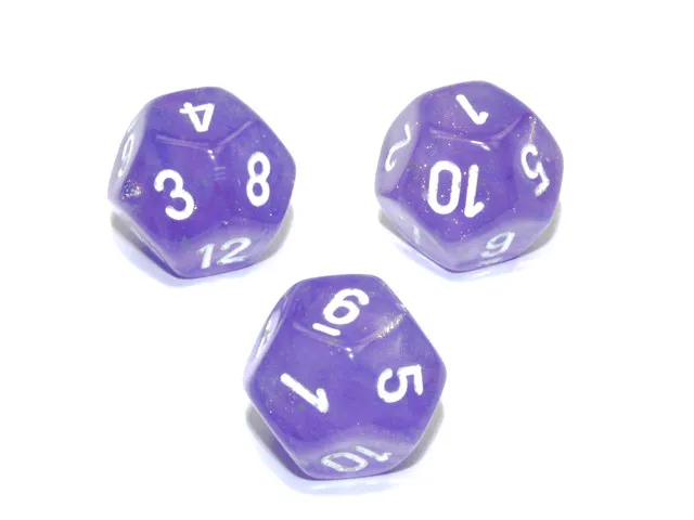 Borealis Polyhedral Purple/white Luminary d12 ~ Multiple loose dice are pictured to show all sides and possible color variations. Item Code is for individual dice.