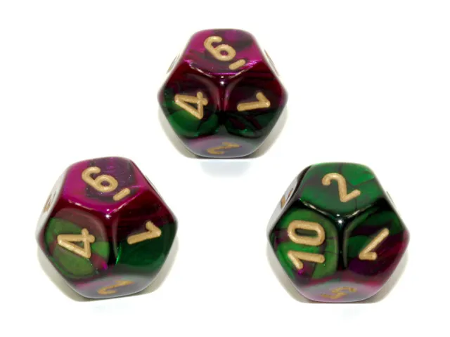 Gemini Polyhedral Green-Purple/gold d12 ~ Multiple loose dice are pictured to show all sides and possible color variations. Item Code is for individual dice.
