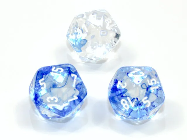 Nebula Polyhedral Dark Blue/white d20 ~ Multiple loose dice are pictured to show all sides and possible color variations. Item Code is for individual dice.
