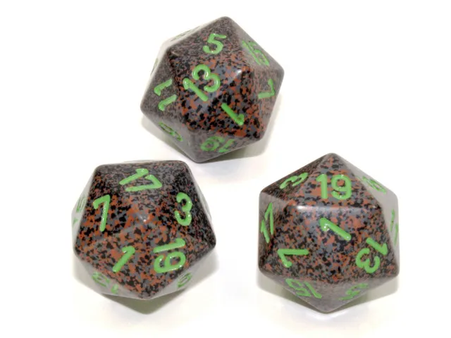 Speckled Polyhedral Earth d20 ~ Multiple loose dice are pictured to show all sides and possible color variations. Item Code is for individual dice.