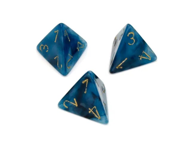 Phantom Polyhedral Teal/gold d4 ~ Multiple loose dice are pictured to show all sides and possible color variations. Item Code is for individual dice.