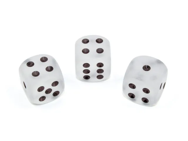 Frosted 16mm w/pips Clear/black d6 ~ Multiple loose dice are pictured to show all sides and possible color variations. Item Code is for individual dice.