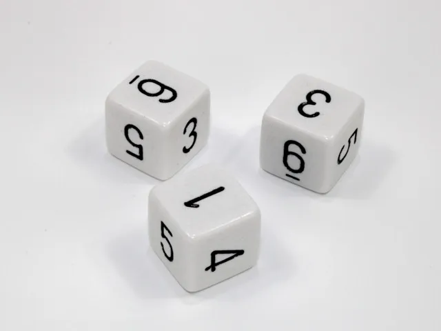 Opaque Polyhedral White/black d6 ~ Multiple loose dice are pictured to show all sides and possible color variations. Item Code is for individual dice.