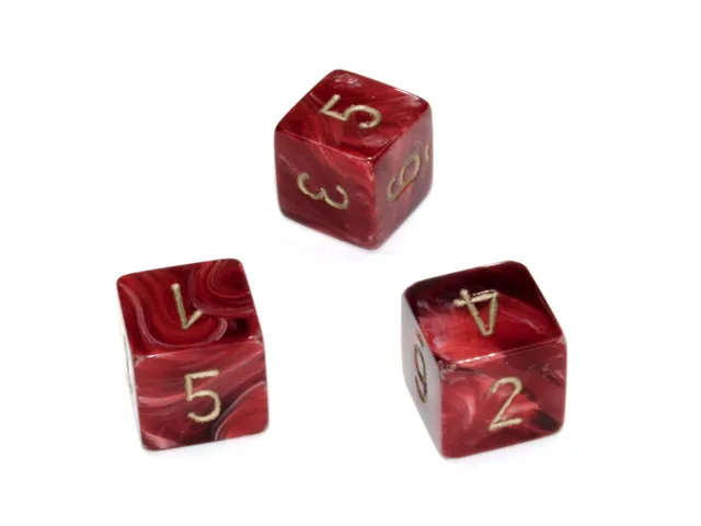 Vortex Polyhedral Burgundy/gold d6 ~ Multiple loose dice are pictured to show all sides and possible color variations. Item Code is for individual dice.