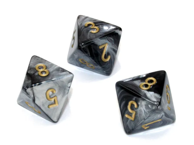 Lustrous Polyhedral Black/gold d8 ~ Multiple loose dice are pictured to show all sides and possible color variations. Item Code is for individual dice.