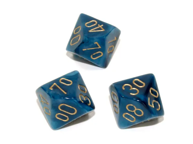 Phantom Polyhedral Teal/gold Tens 10 ~ Multiple loose dice are pictured to show all sides and possible color variations. Item Code is for individual dice.