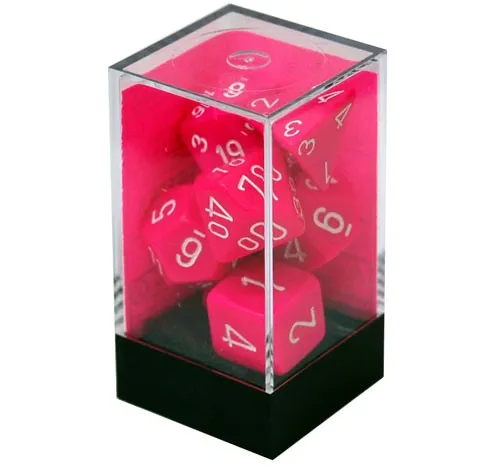 A set of pink opaque dice with white numbers. Contents: 1 Four-sided Die 1 Six-sided Die 1 Eight-Dided die 1 Ten-sided Die 1 10's-place Die 1 Twelve-sided Die 1 Twenty-sided Die