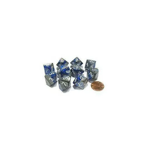 A set of Gemini Polyhedral ten d10s from Chessex, with Blue-Steel background and White numbers