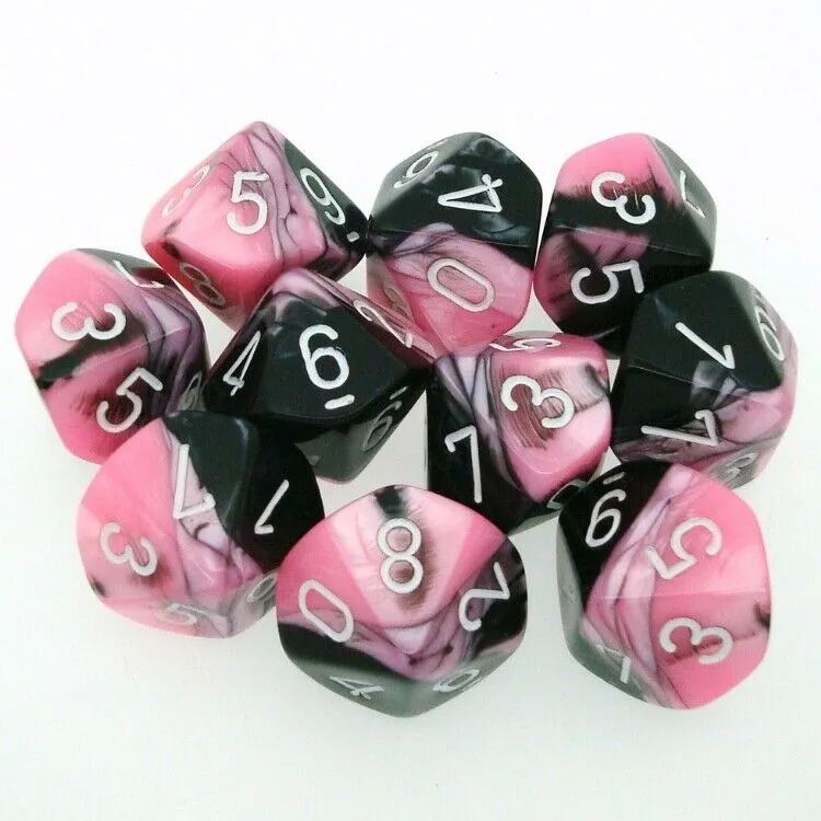A set of Gemini Polyhedral ten d10s from Chessex, with Black-Pink background and White numbers