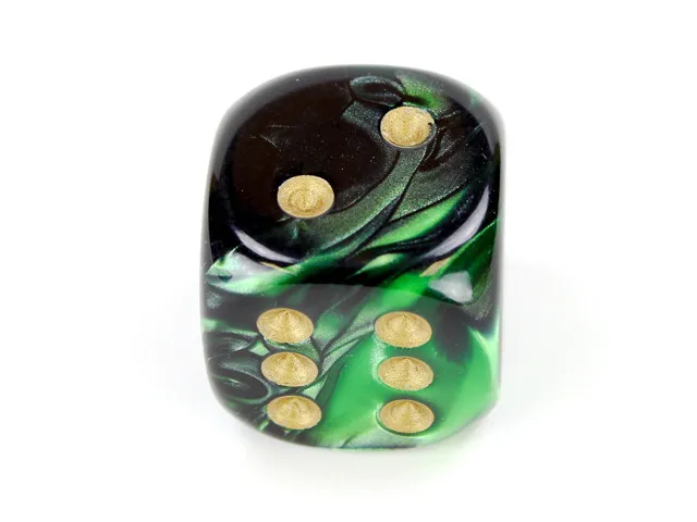 Gemini 20mm w/pips Black-Green/gold d6 ~ Multiple loose dice are pictured to show all sides and possible color variations. Item Code is for individual dice.