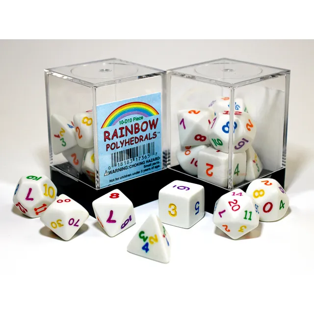 Polyhedral Opaque White w/ Rainbow 7-die set in Plastic box.