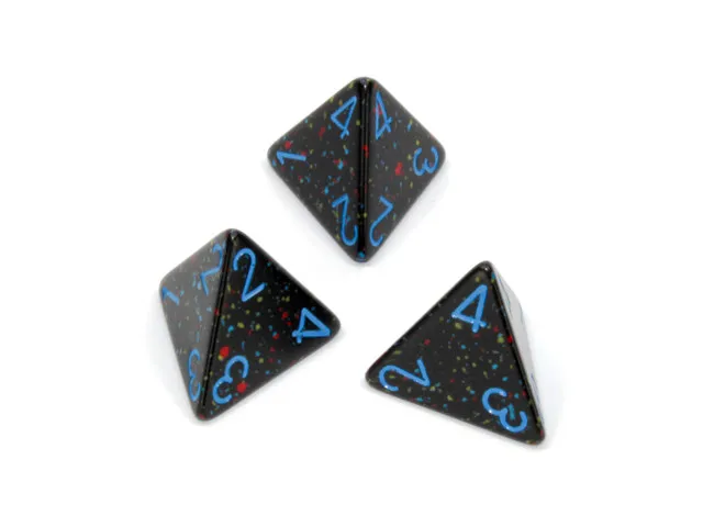Speckled Polyhedral Blue Stars d4 ~ Multiple loose dice are pictured to show all sides and possible color variations. Item Code is for individual dice.