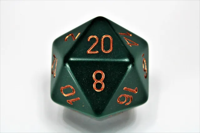 Opaque 34mm Dusty Green/copper d20 ~ Multiple loose dice are pictured to show all sides and possible color variations. Item Code is for individual dice.