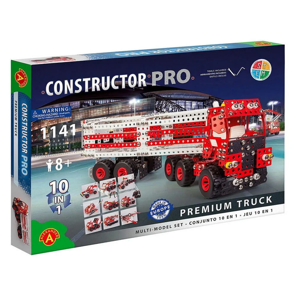 CONSTRUCTOR PRO. The S.T.E.M. Self-assembly construction set by Alexander inspires young and old. With the 1141-piece 10-in-1 Premium Truck set, made of high-quality, painted metal, you can make child-friendly models and well-known vehicles. Set includes: metal parts, shapes & hex screws in different lengths, nuts, washers and 2 tools as well as plastic parts. The construction kits can be combined with each other. The play set is educational value: learning and motor skills toys for children aged 8 and over. Made from local raw materials to minimise carbon footprint and protect the environment Constructor metal construction set with rounded corners and edges.