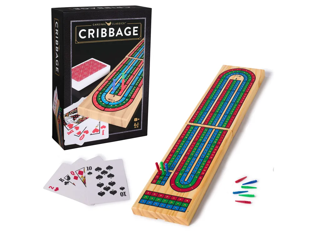 From Cardinal Classics. Includes a solid wooden cribbage board, 9 coloured pegs, a deck of playing cards and instructions.