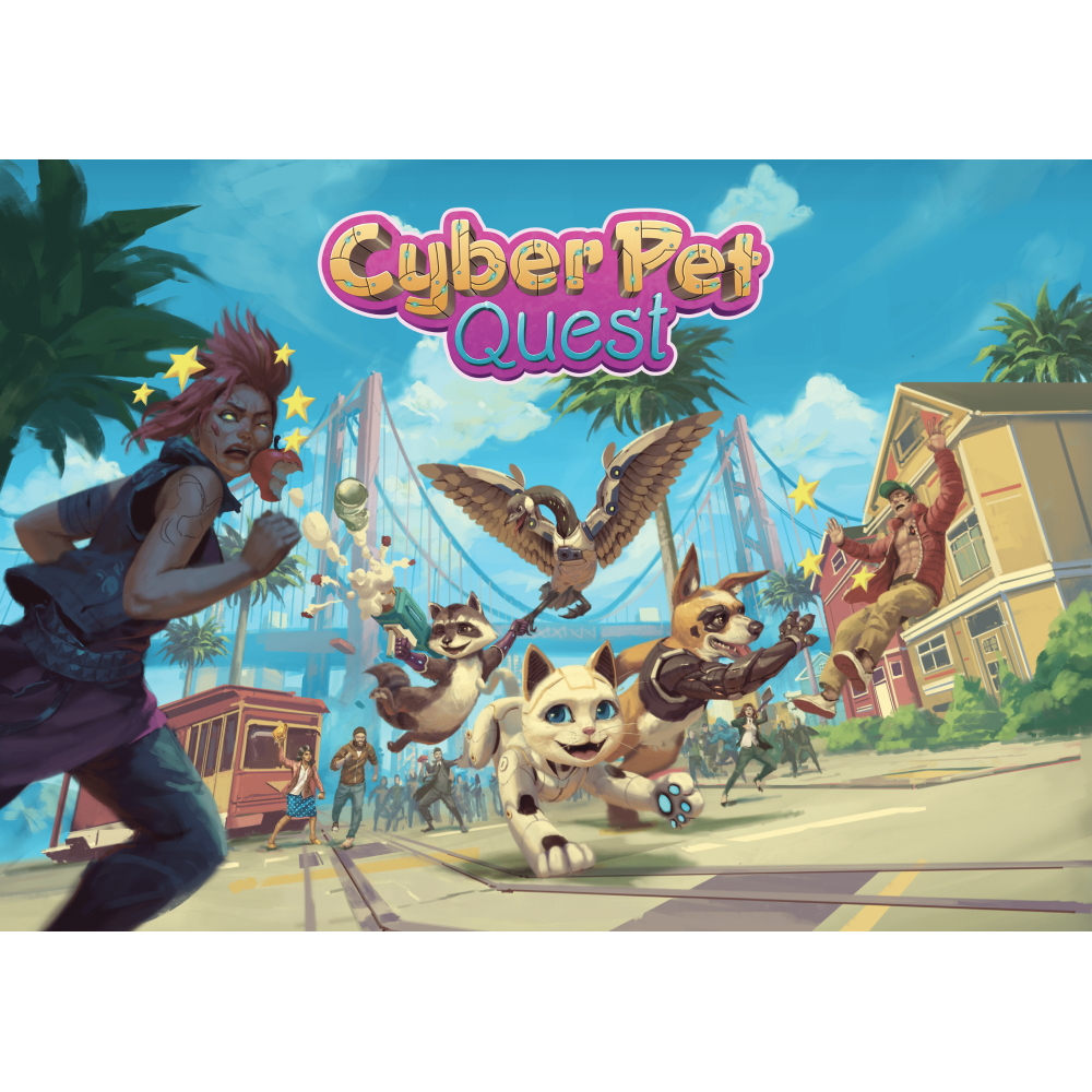 Designed for 1-4 players, Cyber Pet Quest is played as a multi-chapter campaign. Taking the roles of the four pets, players investigate and interact with the environment, complete chapter objectives, gain power items and charms, and outsmart the enemies who are trying to stop them. The campaign has twelve chapters in a branching format so that players can play the full game multiple times to see the different branching stories.
