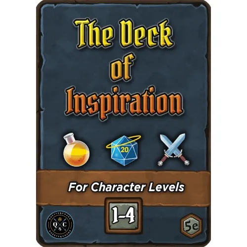 The Deck of Inspiration is designed to enhance the inspiration mechanic of Dungeons & Dragons 5e. The deck provides the DM with unique and fun one-time use boons to reward great player behavior. This deck contains 55 cards covering three types of boons, Divine Inspiration, Potions, and one-time use Magic Items. This deck is designed for character levels 1-4.