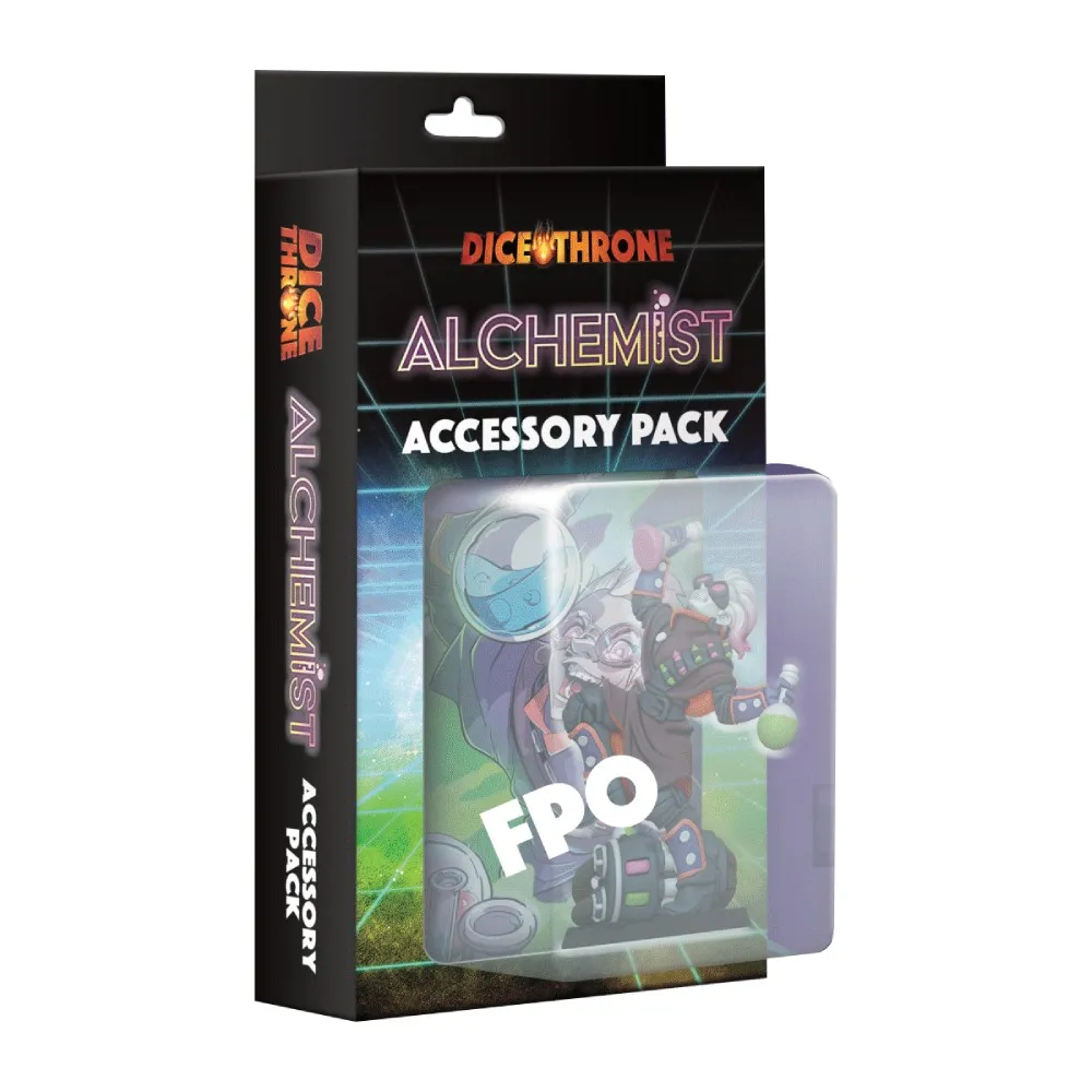 The accessory pack contains a painted hero sculpt for use with Dice Throne Adventures, card sleeves with hero-specific artwork, and acrylic tokens that upgrade the hero's status effects.