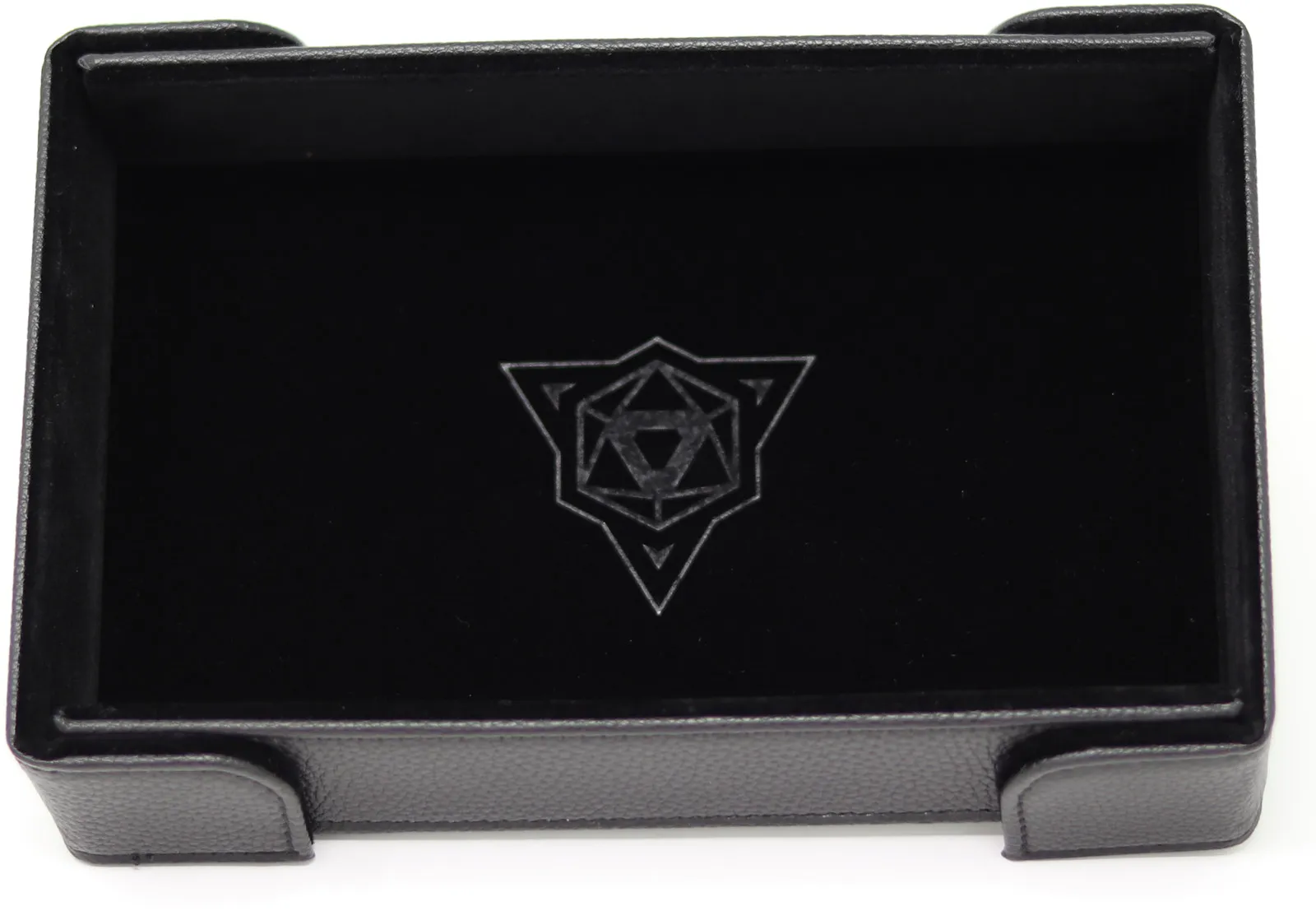 FEATURES Easy to carry to games, easy to setup, small so it doesn't dominate your table! +9 against metal dice damage to wooden tables Quiets loud dice rolls on plastic tables Keeps dice from flying off the table or hitting your minis High quality materials, strong enough for metal dice - velvet rolling surface and vegan leather exterior 8.5" x 11" (same WxL as US Letter Size Paper) when flat, smaller but taller when set up Fits easily into backpacks and folders Durable magnets ensure a perfect setup and seamless takedown without the hassle of snapsMORE THAN ONE WAY TO ROLL This tray has sturdy side walls that you can roll against. We like to leave one wall down and side toss our dice into the tray at a low angle so they hit the back wall, kind of like a mini craps table.   MEASUREMENTS 8.5 x 11 inches when flat. In "Dice Tray" mode it is 5 x 7.75 inches with 1.75 inch high walls.