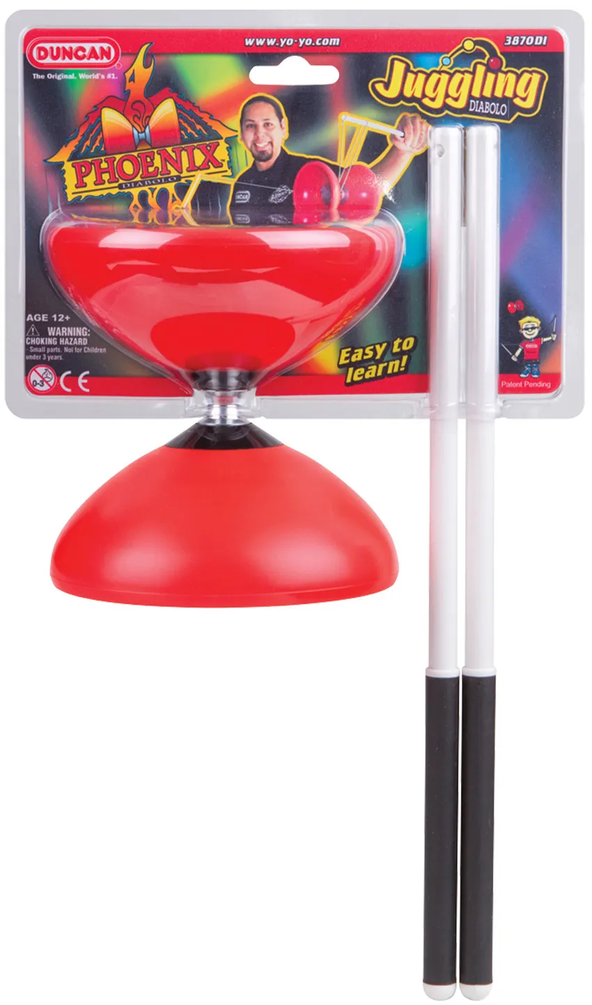 No longer will diabolo players have to choose between a fixed axle and bearing diabolo! Duncan® now offers both in a single diabolo with the Phoenix! By hand tightening the knobs the player can quickly switch axles back and forth for variations in play and to accommodate any skill level. Featuring high speed roller bearing technology for low string friction and long spin times, Phoenix is the only diabolo for both beginner and pro players alike!