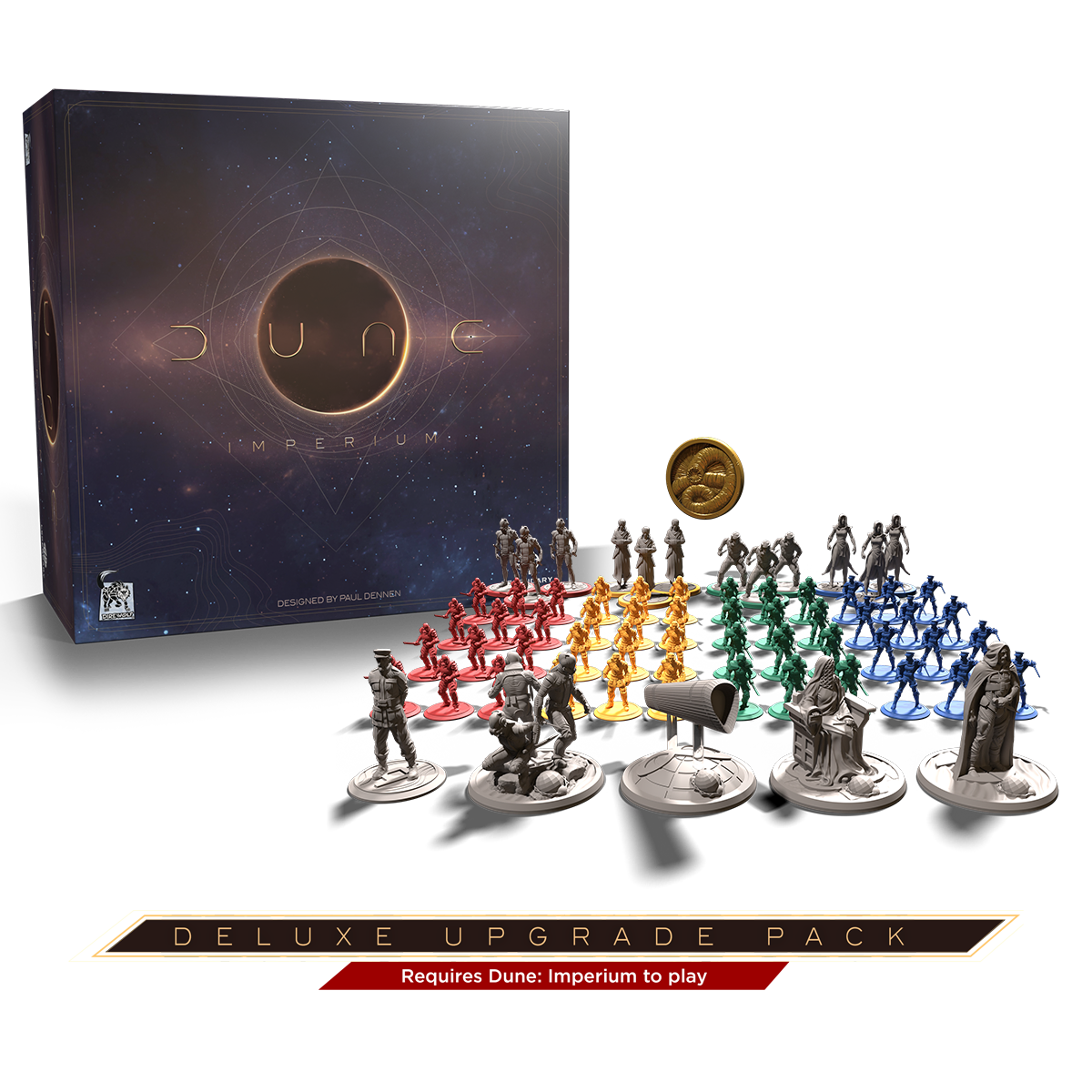 Enhance your Dune: Imperium experience with the Deluxe Upgrade Pack! This cosmetic expansion upgrades the components of the base game for a more immersive experience. The contents come in an oversized box with plastic storage trays that store the whole game (including sleeved cards).