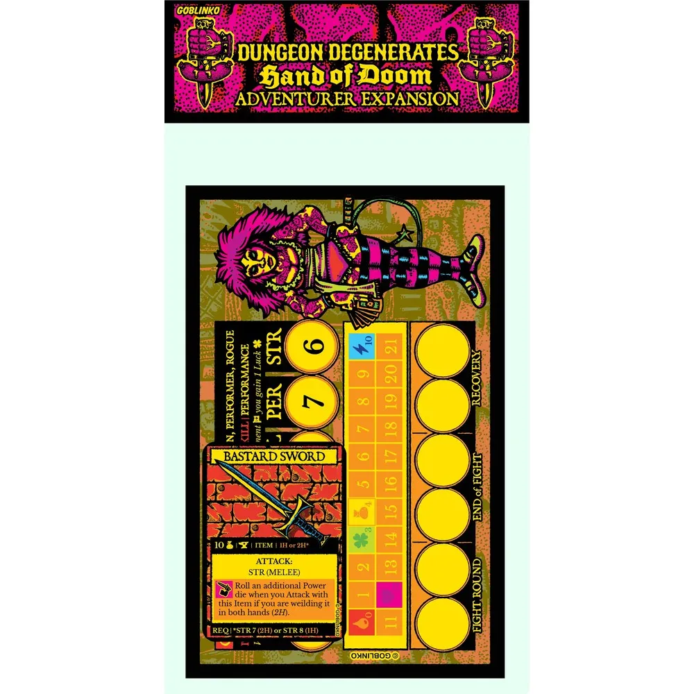 Eight additional playable adventurers for the Dungeon Degenerates Hand of Doom board game! Includes - Soldier of Fortune, Carnival Drifter, Dishonored Knight, River Pirate, Jack Slasher, Alley Cat, Wastelander & Banished Sorcerer! Including 10 Skill Cards, 16 Loot Cards, character sheets & standees of the characters! For Dungeon Degenerates.
