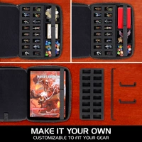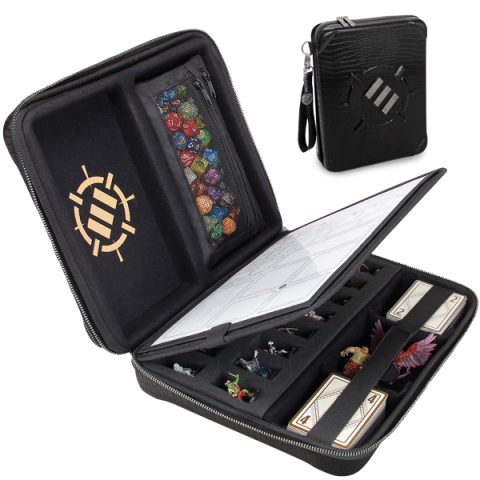 An all-in-one storage case for RPG players. Features a unique binder design with custom compartments for dice, miniatures, class ability cards, and more. Also features two sides, each with various compartments. The left side has a large dice rolling tray, a removable pencil/accessory pouch, and a spare document compartment behind the dice tray area. The right side is a foam tray with 16 slots for miniature figures and a modular section for storing cards, dice, and other accessories. In the center is a divider with a transparent panel to store and protect a character sheet; players can write directly onto the transparent panel with dry erase markers—a unique feature of the ENHANCE RPG Organizer Case.