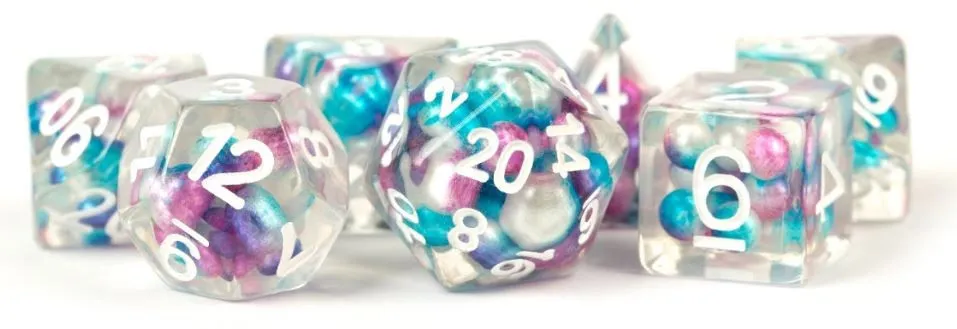 A beautiful set of 7 polyhedral dice with gradient Purple/Teal/White pearl resin and white coloured numbers.