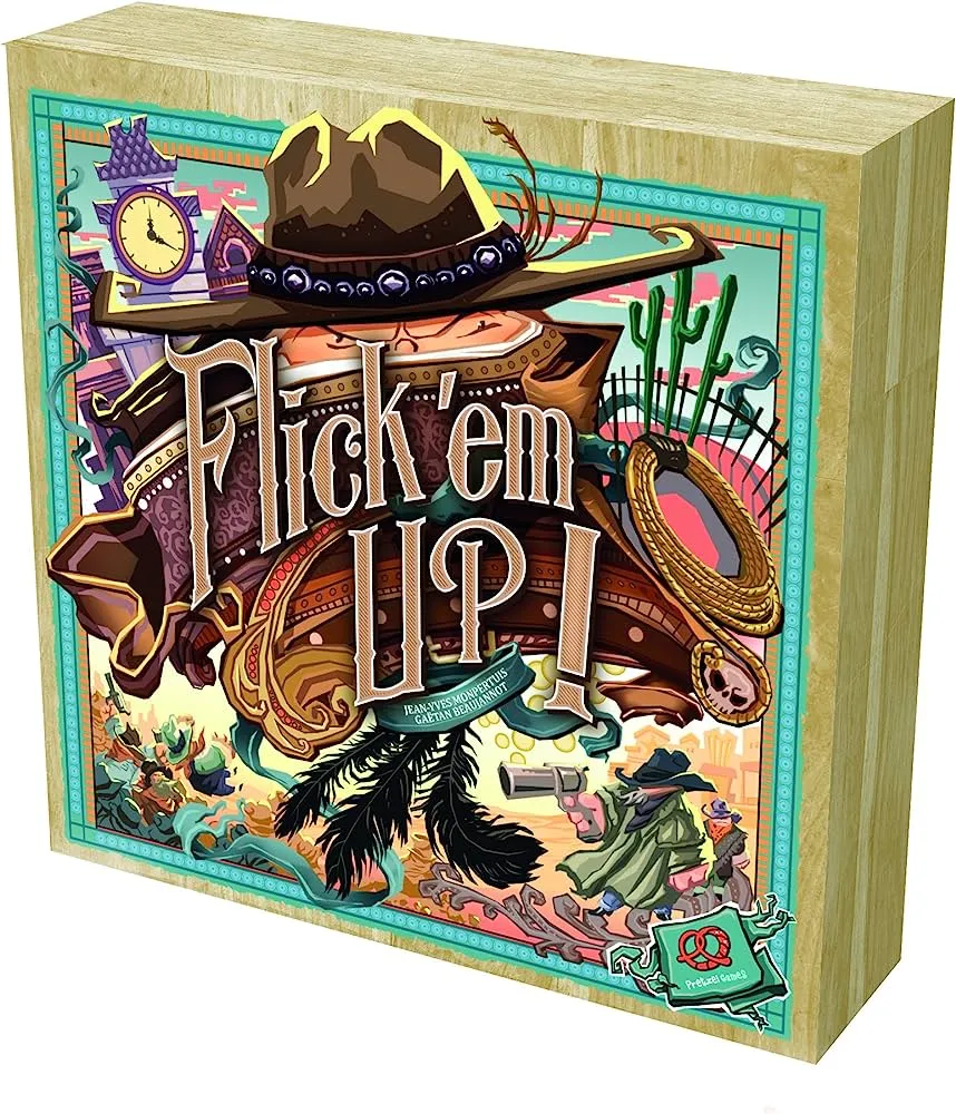Welcome to the exciting world of Flick 'em Up! - a game whose immersive scenarios and exceptional components will transform your kitchen table into a rugged, ruthless town of the wild west. Load your Colt, take cover, and return fire. You're a darn fool if you think your enemies are about to show you any mercy.