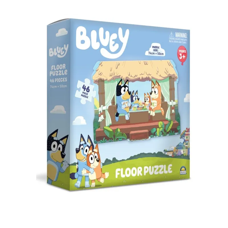 This huge Bluey Floor Puzzle features the cute Aussie pooches from the ABC hit show. Starring Bluey, Bingo, Bandit and Chilli, this amazing 46pce shaped puzzle is easy to assemble with large sized pieces ideal for small hands. 74cm x 50cm this enormous puzzle is a sight to see! Use the box as storage so you can assemble over & over again.