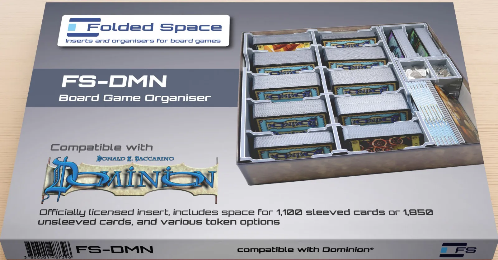 Official insert compatible with Dominion®,with space for  1,100 sleeved or 1,850 unsleeved cards. The design provides both efficient storage and improved game play, with removable token trays for use during the game. The rule books act as a lid on top of the trays.