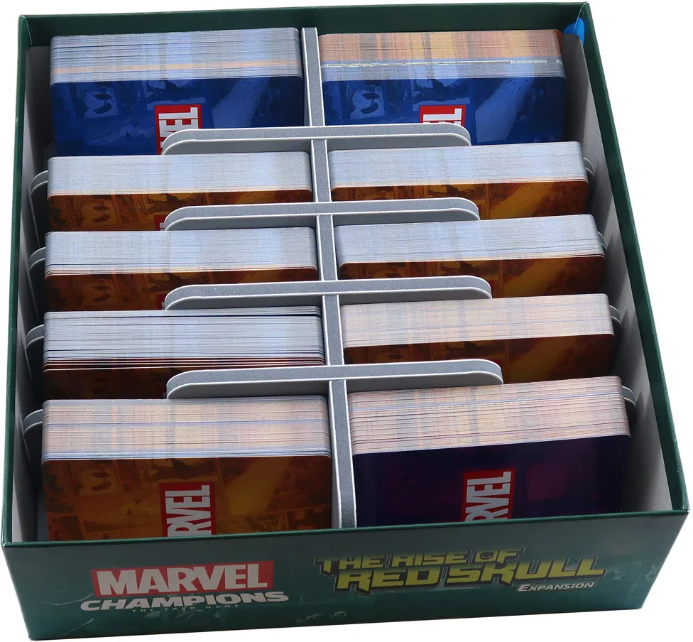 Insert compatible with Marvel Champions: The Rise of Red Skull® expansion, with space for 725 sleeved and 1,150  unsleeved cards. The design provides both efficient storage and improved game play.
