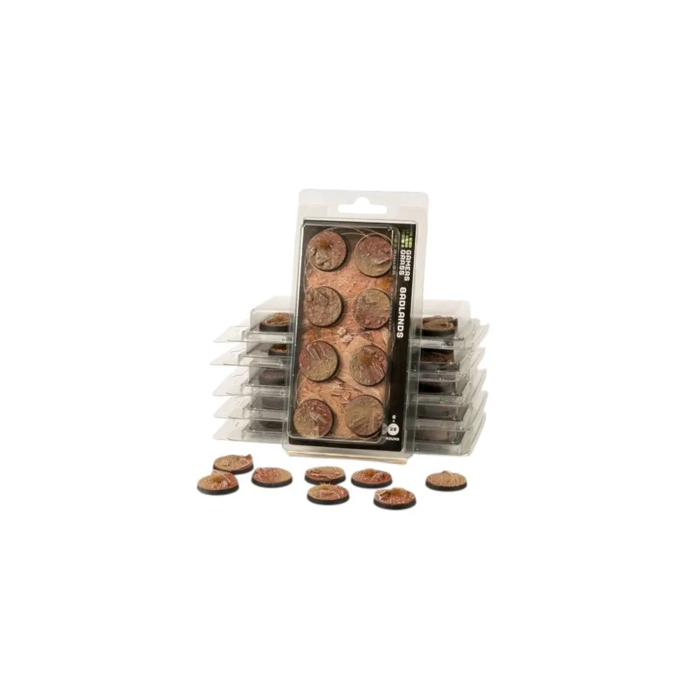 This pack contains 8 x 28mm wide round Battle Ready Bases in a badlands theme.