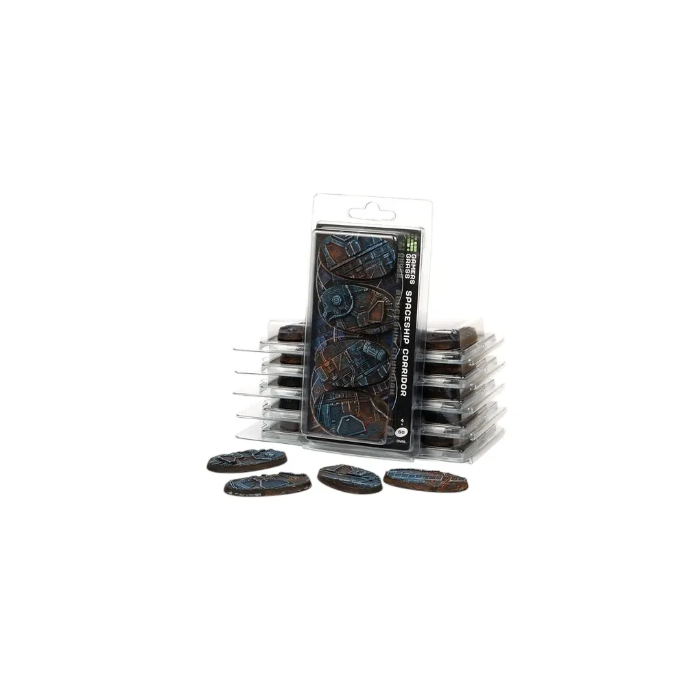 This blister contains 4 thermoplastic 60mm wide oval Battle Ready Base, in a Spaceship Corridor theme.