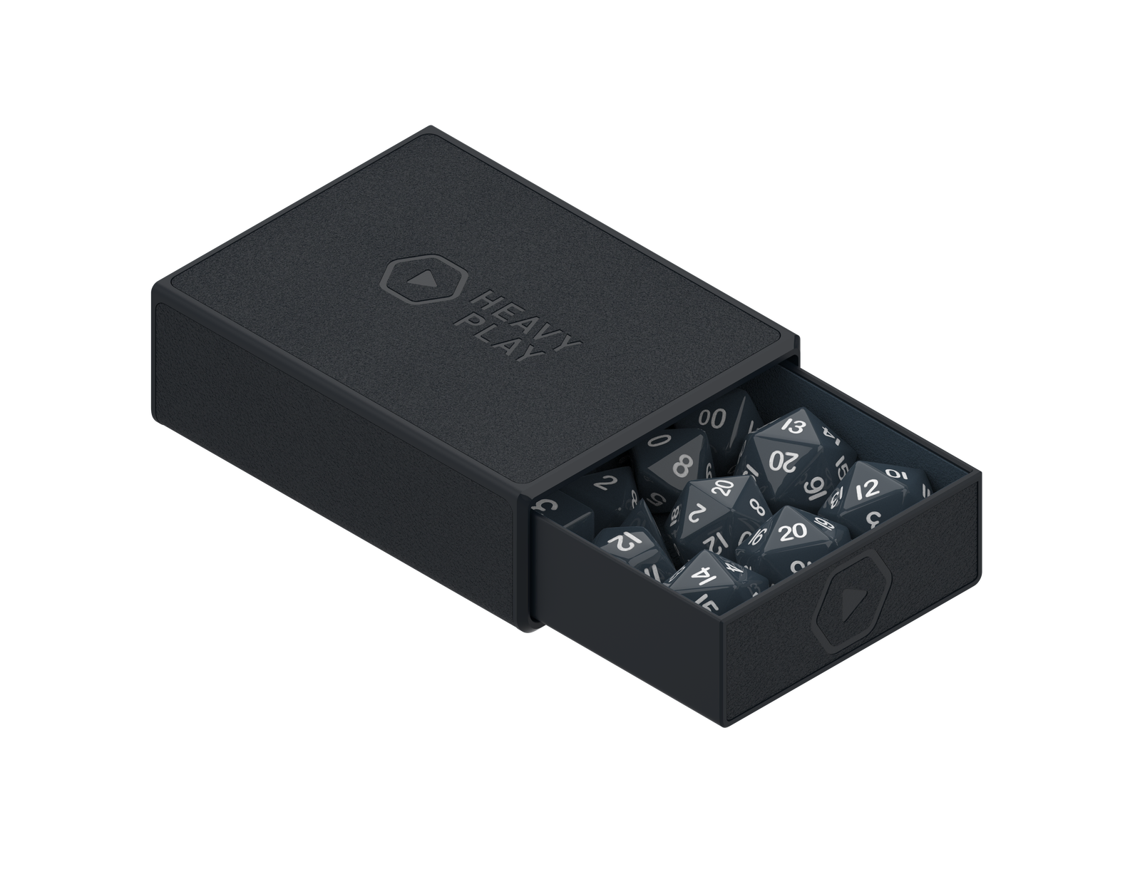 The ultimate dice box. Fits 4x D20 spindowns, a full set of 7x RPG dice, and a bunch of extra D6's or tokens. Magnetic tray slides out and pops on top for easy dice access during gameplay. Durable vegan leather exterior. Soft microfiber lining to dampen rattling.