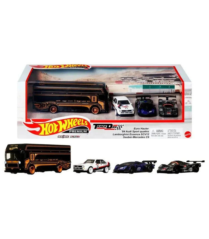 Collect premium Hot Wheels vehicles in a distinctive window display package that includes three die-cast cars and one Team Transport vehicle.